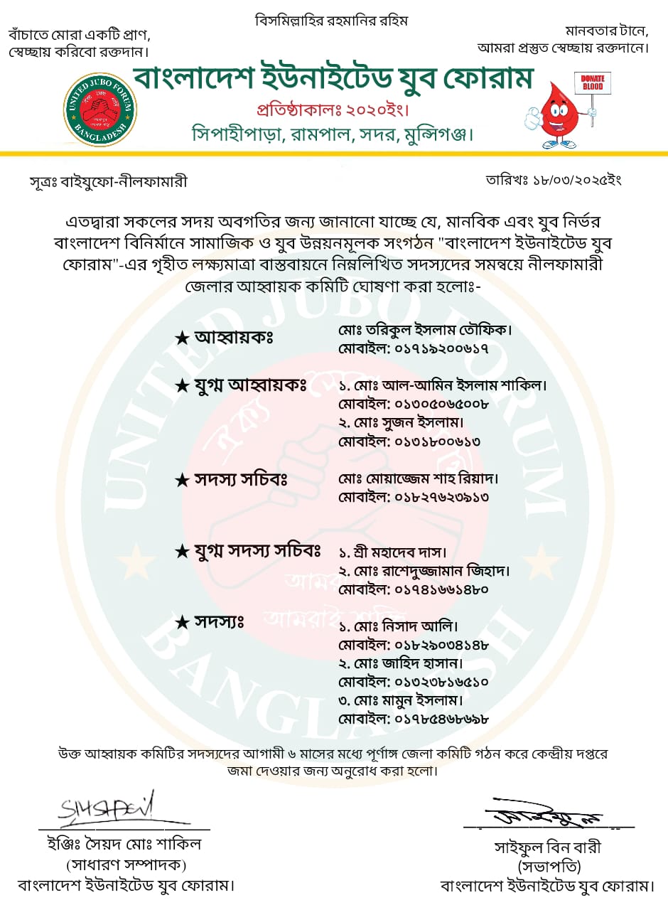 বাংলাদেশ ইউনাইটেড যুব ফোরাম-এর নীলফামারী জেলা আহ্বায়ক কমিটি গঠন