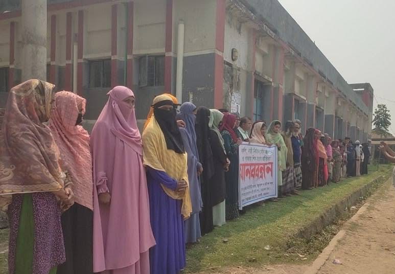 মানববন্ধনে নারী দল, ইয়ুথ গ্রুপ, কমিউনিটি ফোরাম সদস্যসহ এলাকার সাধারণ মানুষ অংশগ্রহণ করেন।
