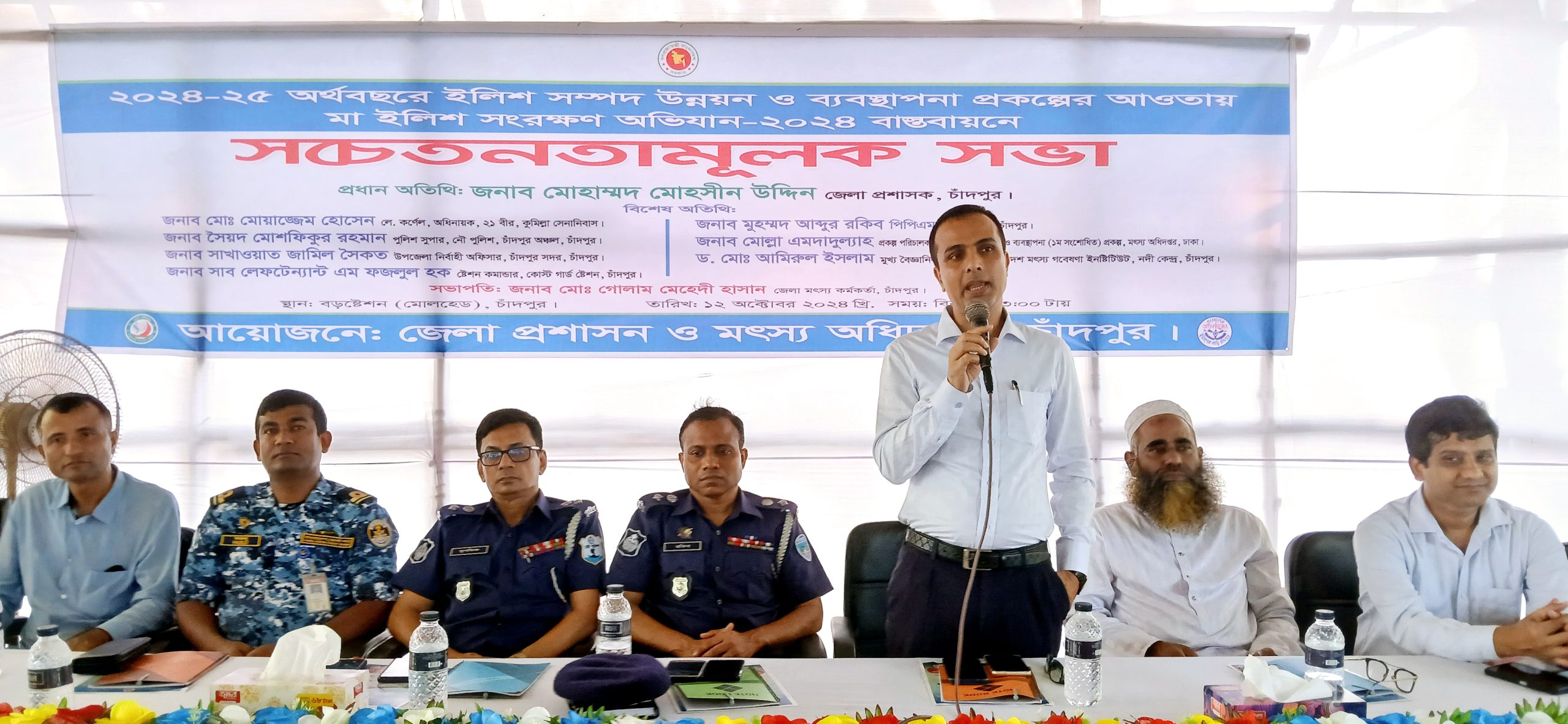 চাঁদপুর জেলা মৎস্য কর্মকর্তা মো: গোলাম মেহেদী হাসানের সভাপ্রধানে বিশেষ অতিথির বক্তব্য রাখেন অতিরিক্ত জেলা প্রশাসক (সার্বিক) মোস্তাফিজুর রহমান, চাঁদপুর পুলিশ সুপার মুহম্মদ আব্দুর রকিব পিপিএম, নৌ পুলিশ সুপার সৈয়দ মোশফিকুর রহমান, উপজেলা নির্বাহী অফিসার সাখাওয়াত জামিল সৈকত, কোস্ট গার্ড ষ্টেশন কমান্ডার সাব লেফটেন্যান্ট এম ফজলুল হক, ঢাকা মৎস্য অধিদপ্তরের ইলিশ সম্পদ উন্নয়ন ও ব্যাবস্থাপনা ‘১ম সংশোধিত’ প্রকল্প পরিচালক, মোল্লা এমদাদুল্যাহ, বাংলাদেশ মৎস্য গবেষণা ইনষ্টিটিউট, নদী কেন্দ্রের মুখ্য বৈজ্ঞানিক কর্মকর্তা ড. মোঃ আমিরুল ইসলাম প্রমুখ।