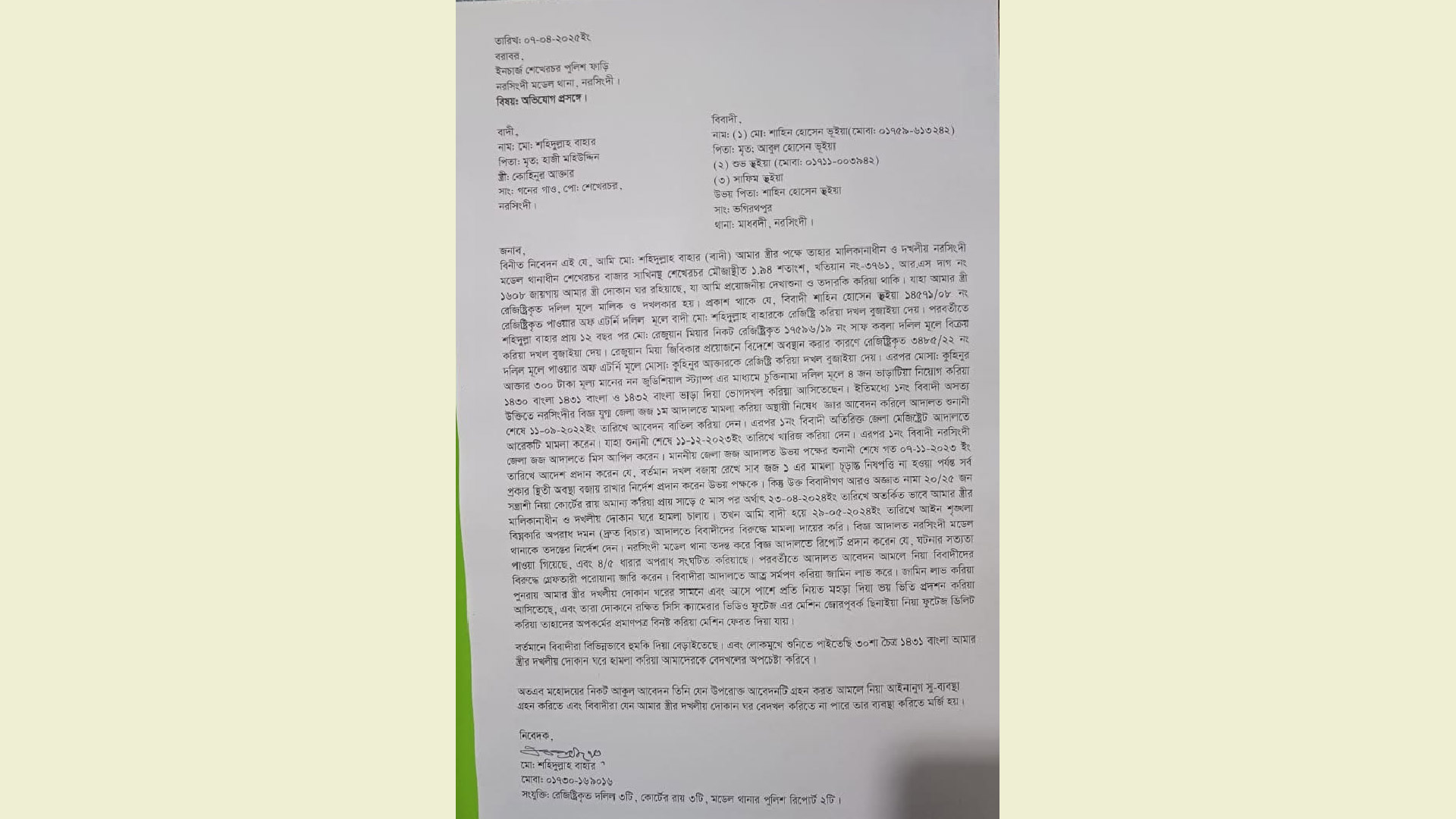 বিজ্ঞ আদালত নরসিংদী মডেল থানাকে তদন্তের নির্দেশ দেন। নরসিংদী মডেল থানা পুলিশ তদন্ত করে বিজ্ঞ আদালতে রিপোর্ট প্রদান করেন যে, ঘটনার সত্যতা পাওয়া গিয়েছে এবং ৪/৫ ধারার অপরাধ সংঘটিত করিয়াছে। পরবর্তীতে আদালত আবেদন আমলে নিয়া বিবাদীদের বিরুদ্ধে গ্রেফতারী পরোয়ানা জারি করেন। বিবাদীরা আদালতে আত্ম সর্মপণ করে জামিন লাভ করিয়া পুনরায় তাহার স্ত্রীর দখলীয় দোকান ঘরের সামনে এবং আসে পাশে প্রতি নিয়ত মহড়া দিয়া ভয় ভীতি প্রদর্শন করিয়া আসিতেছে এবং তারা দোকানে রক্ষিত সিসি ক্যামেরার ভিডিও ফুটেজ এর মেশিন জোরপূবর্ক ছিনাইয়া নিয়া ফুটেজ ডিলিট করিয়া তাহাদের অপকর্মের প্রমাণপত্র বিনষ্ট করিয়া মেশিন ফেরত দিয়া যায়।