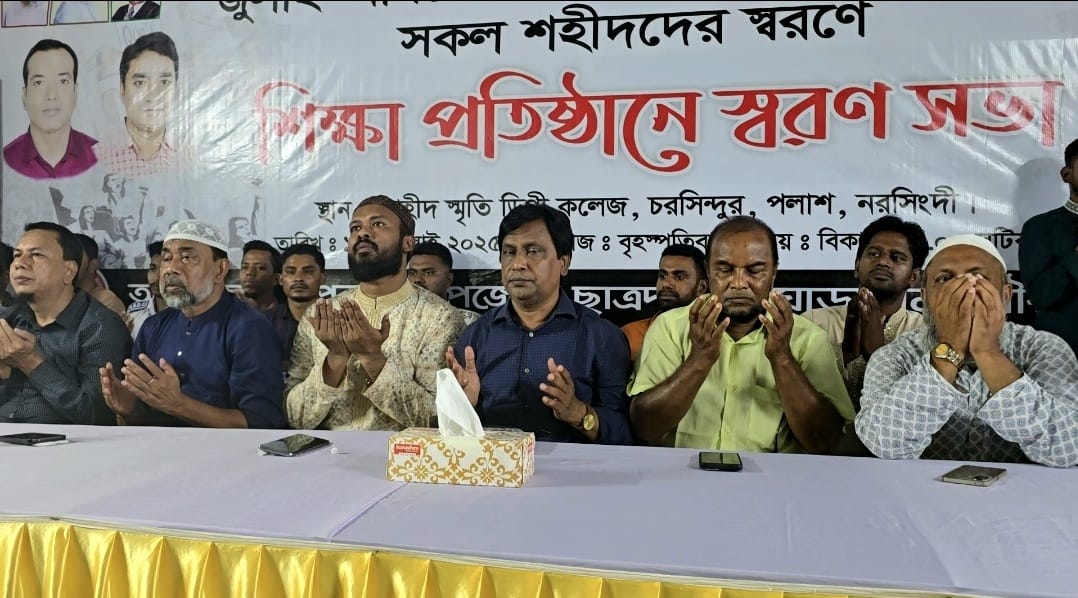 জুলাই-আগষ্টের ঐতিহাসিক গণঅভ্যুত্থানে সকল শহীদের স্মরণে স্মরণসভা করেছে নরসিংদীর পলাশ উপজেলা ও ঘোড়াশাল পৌরসভা ছাত্রদল।
